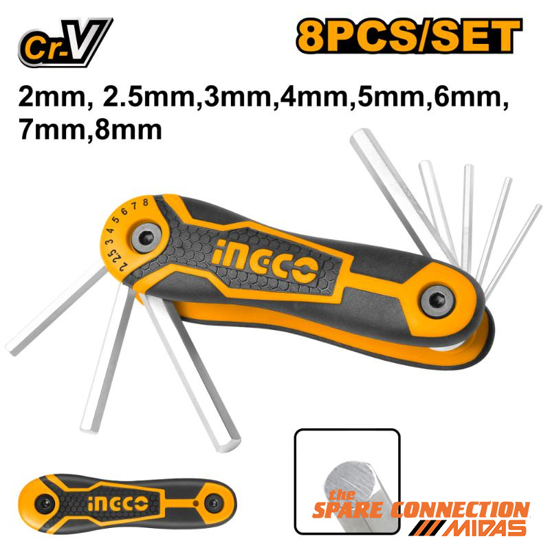 8 pieces hex key (Pocket)Size: 2 mm, 2.5 mm, 3 mm, 4 mm, 5 mm, 6 mm, 7 mm, 8 mm.Material: Cr-VHeat treatment.Chrome plate.