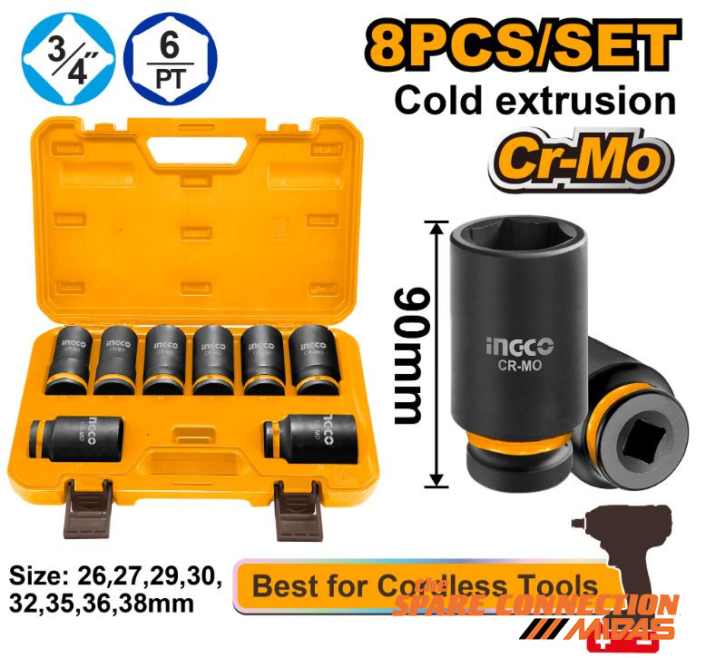8 Piece 3/4″”DR. Deep impact socket setDrive size:3/4″”Deep impact socket size: 26. 27. 29. 30. 32. 35. 36. 38 mmLength: 90 mmMaterial: Cr-MoCold extrusionHeat treatment