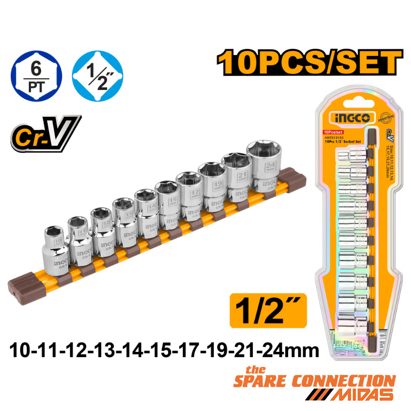 Includes:10 pieces 1/2″” sockets:10, 11, 12, 13, 14, 15, 17, 19, 21, 24 mm