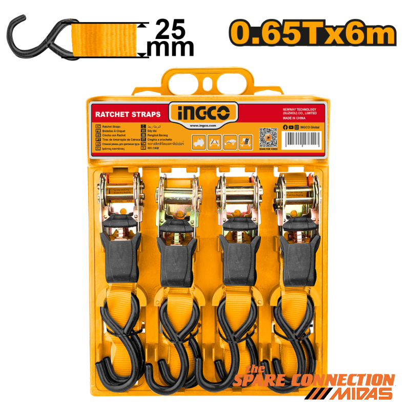 Load: 0.65T Length: 6 m. Width: 25 mm S.F.: 2:1 4 pieces/set. Ribbon material: PES, secure your equipent. Includes: 4 pieces ratchet and S hook.