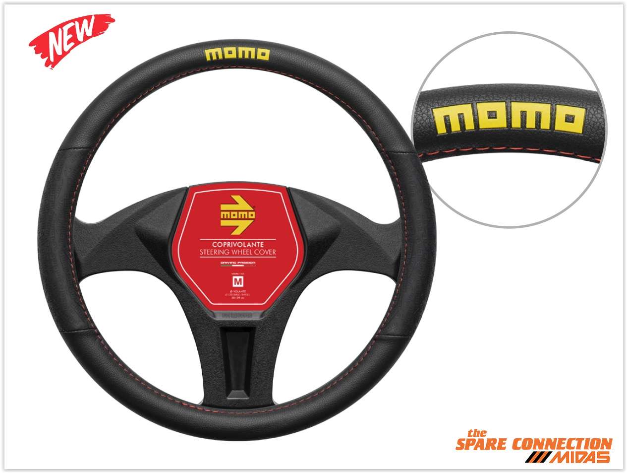 M SIZE (Ø 38~39 cm): SWC0LAPBRBLACK-BLACK, YELLOW MOMO LOGO• SOFT BLACK PVC• SIDE HANDLE WITH MOMO LOGOS IN RELIEF• RED STITCHING• YELLOW MOMO LOGO ON TOP