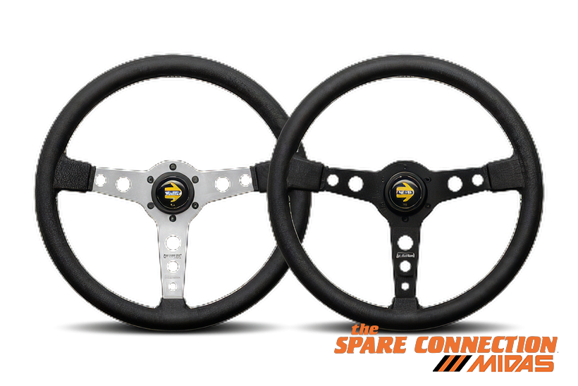 BLACK LEATHER, BLACK OR SILVER SPOKES, PARALLEL WHITE STITCHING.Ø 320 mm / Ø 350 mm