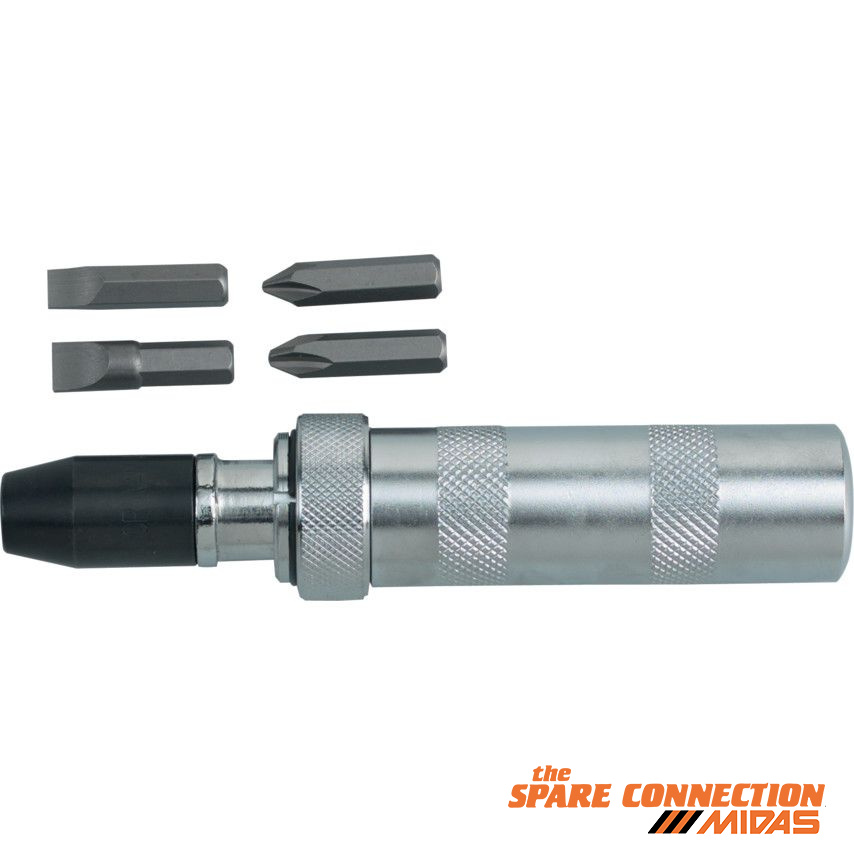 ndustrial quality impact driver with switchable forward and reverse screwdriver rotation. When the impact resistant handle is struck with a hammer the downward force is converted by the impact driver's internal mechanism into a powerful high torque screwdriver rotation action. Ideal for ensuring fasteners are securely tightened and for freeing stuck fasteners. Hex drive nose pieces can be removed to allow use with 1/2" square drive impact sockets.