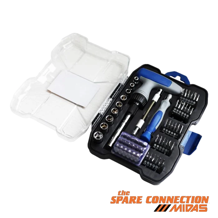 1-RATCHET T- HANDLE, 1-PRECISION SCREWDRIVER HANDLE, 1- SOFTEXTENSION BAR, 18 - CR-V BITS, 30 -PRECISION BITS AND 9-SOCKETS