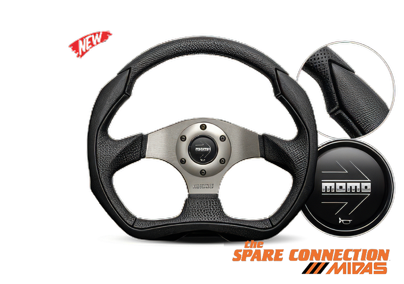PREMIUM BLACK LEATHER AIRLEATHER INSERTS, MATT BLACK MOMO,HORN BUTTON, ANTHROCITE ALUMIMIUM RING FRAME. Ø 350 mm