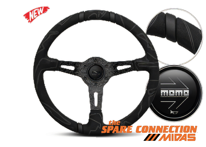 YELLOW MOMO LOGO ON RIGHT INSERT, MATT BLACK HORN BUTTON. Ø 350 mm