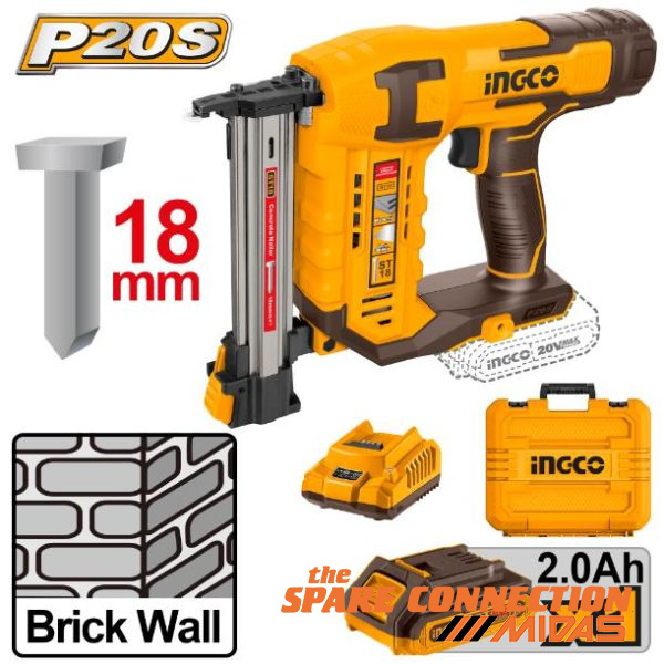 Voltage: 20VNail type: ST18 mmDrive rate: 2 nails/sMagazine capacity: 65 PieceApplications: Perfect for brick wall, iron sheets(≤ 1 mm), wood