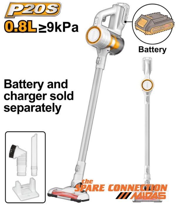 Voltage: 20VVacuum pressure (KPa): >9 KpaCapacity: 0.8LPower(W): 120WMultiple cyclonePure copper wire motorBattery and charger sold separatelyHEPA filter