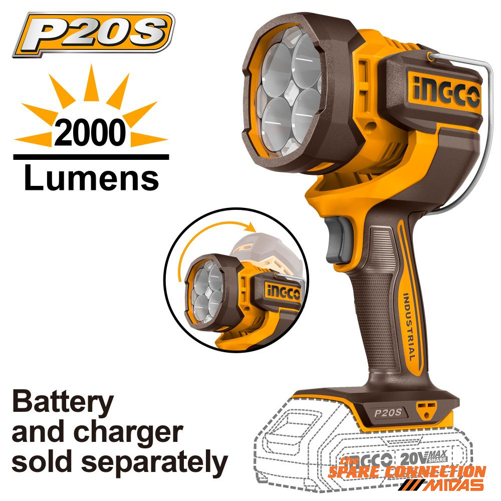 Voltage: 20VLED power dissipation: 22.5WLumens: 2 000 ± 10%Ergonomic grip with soft gripThe LED lamp head can be swivelled through 130° degreesBattery and charger sold separately