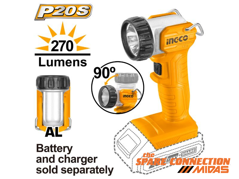 Voltage: 20VLED power dissipation: 22.5WLumens: 2 000 ± 10%Ergonomic grip with soft gripThe LED lamp head can be swivelled through 130° degreesBattery and charger sold separately