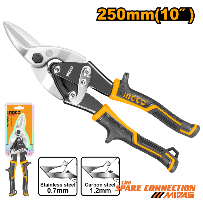 Aviation snip(Left)Length: 10"/250mmMax.cutting thicness:Carbon steel ≤1.2mmStainless steel ≤0.7mmUnique design three tone soft handle