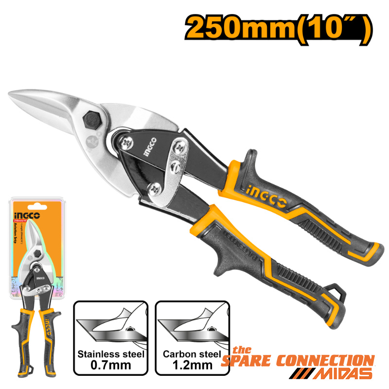 Aviation snip(Right)Length: 10"/250mmMax.cutting thickness:Carbon steel ≤1.2mmStainless steel ≤0.7mmUnique design three tone soft handlePacked by half double blister
