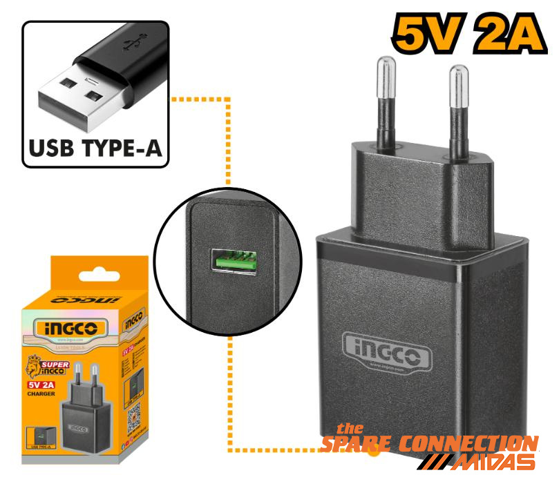 Ingco 5V 2.0A Type-A USB Charger | FCLI120502. Input voltage: 220 - 240V ~ 50/60Hz Output voltage: 5V Output current: 2A Charging port: USB type-A