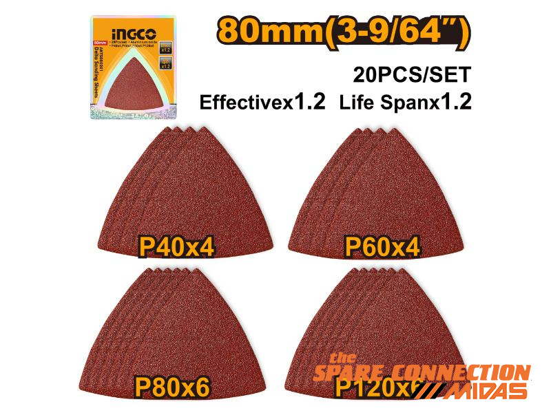 Ingco 20Pc Delta Sanding Sheet Assortment, 80mm | AKTS080201. 80 mm delta. P40 x 4, P60 x 4, P80 x 6, P120 x 6. Aluminum Oxide. 20 pieces/Set