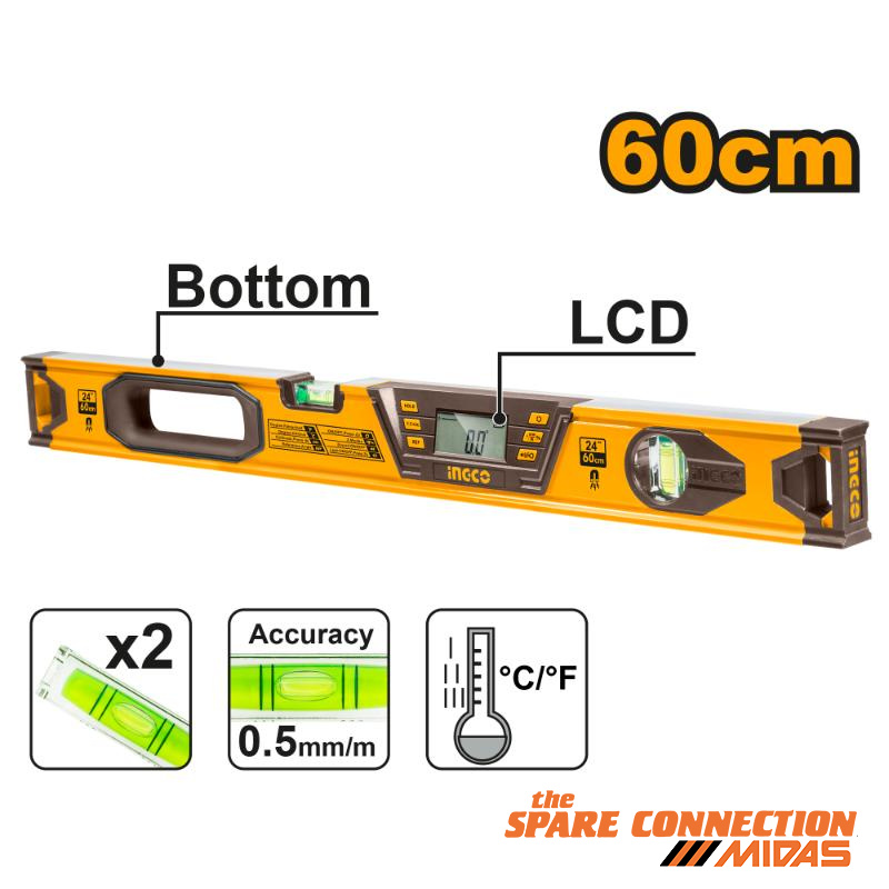 Length: 60cmMeasuring ranger:0~360°(4*90°)Measuring accuracy:±0.23 Pcs powerful magnetsDouble side milled0.5mm/m accurate vialsThickness:1.5mmDouble flat surfaces designWith 2pcs R03 AAA batteries