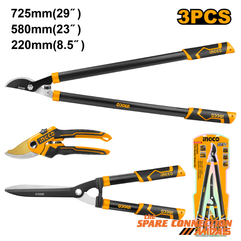 3pcs garden shears set Include: 1pcs 220MM/8 5'' Pruning Shear, 1pcs 557mm/22'' Hedge shear, 1pcs 725mm/29'' Lopper, Heat treatment blade, Blade painted teflon.