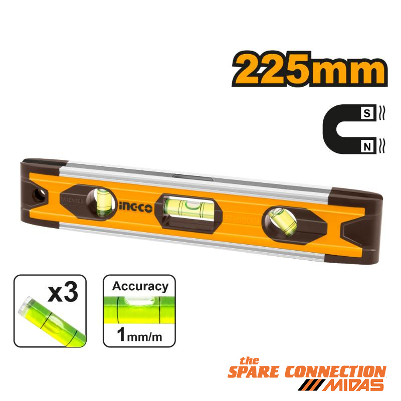 INGCO MINI SPIRIT LEVEL. Length: 225 mm; Material: Aluminium and ABS Plastic; Magnetic; 3 Level Measurment Vials