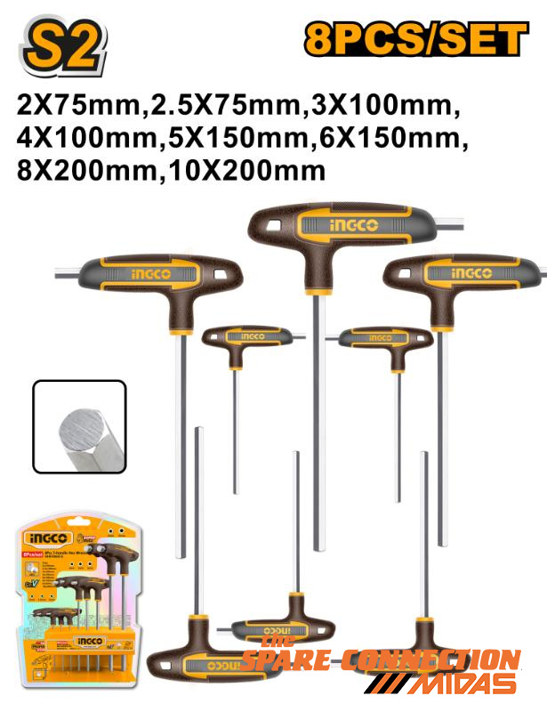 8 pieces T-handle hex wrench setSize: 2 x 100, 2.5 x 100, 3 x 100, 4 x 150, 5 x 150, 6 x 150, 8 x 200,10 x 200Material: Cr-VHeat treatment.Chrome plate.Brand exclusive shelf.