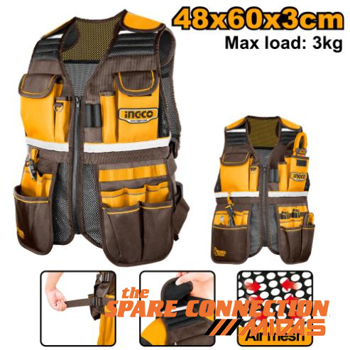 Size: L48xW60xH3cmAdjustable shoulder straps and waist sizeAir mesh materialMax load: 3kgMultiple use compartments for all storage needsWith 17 pocketsĀ