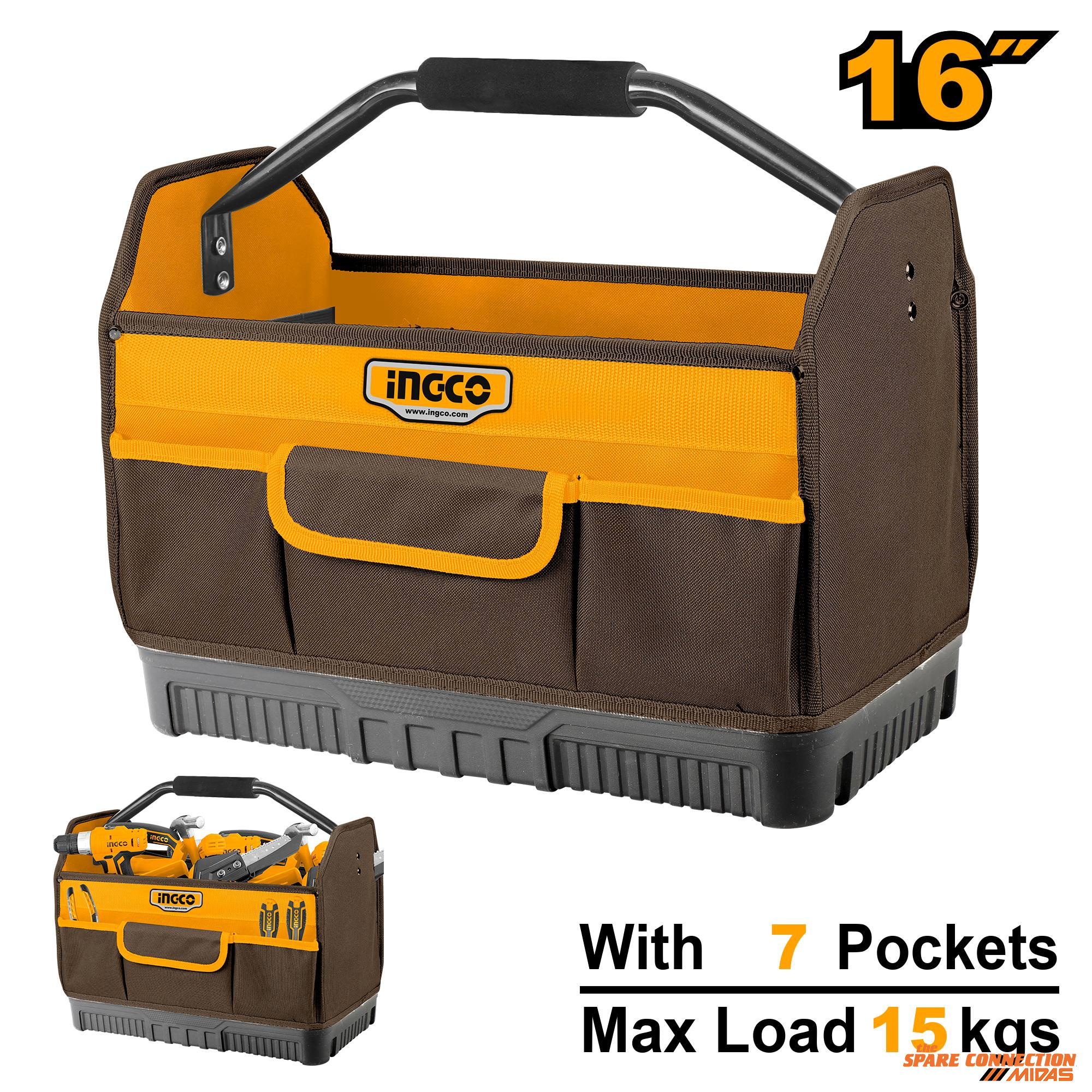 Product Details: - Size: 16" - 7 Piece pockets for tools - Material: 1680D polyester - Max load: 15kg - Size (L x W x H): 41 x 23 x 32 cm