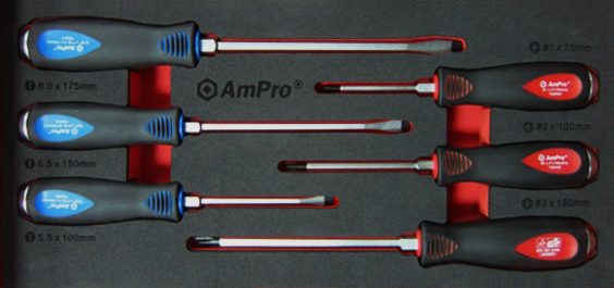 3 – Slotted Screwdrivers: 5.5 x 100mm, 6.5 x 150mm, 8 x 175mm
