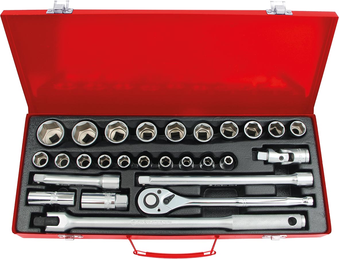 • Contents:20 – 1/2″ Dr. 6pt Sockets:8, 9, 10, 11, 12, 13, 14, 15, 16, 17, 18, 19, 20, 21,22, 23, 24, 27, 30, 32mm1 – 1/2″ Dr. Quick Release Ratchet (Metal Grip)1 – 1/2″ Dr. Universal Joint2 – 1/2″ Dr. Spark Plug Sockets: 16mm, 21mm2 – 1/2″ Dr. Extension Bars: 5″ (125mm), 10″ (250mm)1 – 1/2″ Dr. x 15″ (380mm) Flexible Handle Metal Case