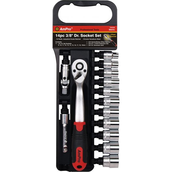 11 – 3/8″ Dr. 6pt Sockets:8, 10, 11, 12, 13, 14, 15, 16, 17, 18, 19mm1 – 3/8″ Dr. Quick-Release Offset Ratchet1 – Extension Bar:3/8″ Dr. x 3″ (75mm)1 – 3/8″ Dr. Universal Joint