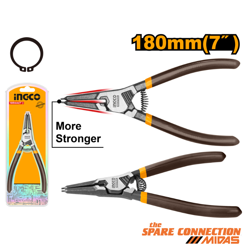 Straight head circlip PlierExternal circlip plierSize: 7″/180 mmDiameter of the head: 1.8 mmMaterial: Cr-VSurface treatment: black finish and polish
