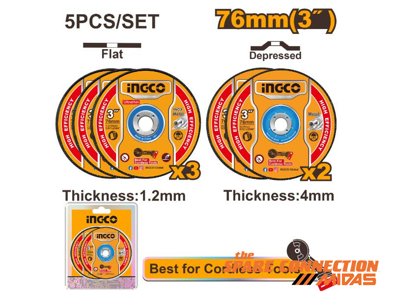 5 pieces/set 3 pieces Abrasive metal cutting disc: 76 mm (3") x 1.2 mm (3/64") x 10 mm (25/64") 2 pieces abrasive metal grinding disc: 76 mm (3") x 4.0 mm