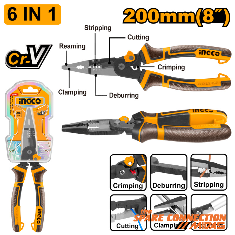 6-in-1 Multi-function long nose pliersSize: 8″/200 mmMaterial: Cr-VSurface treatment: black finish and polishMulti-purpose built let you complete more tasks with one toolTPR three colour handle for strong grip and comfort