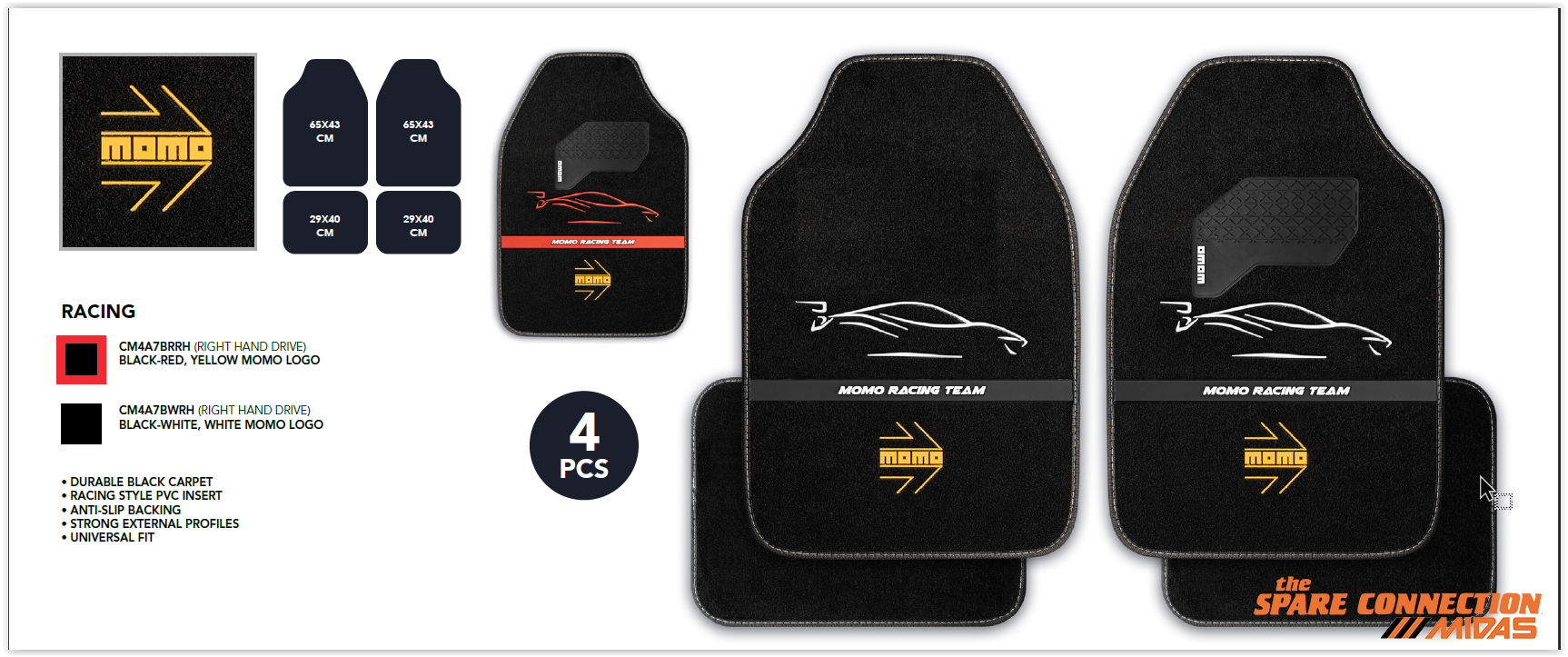 • DURABLE BLACK CARPET• RACING STYLE PVC INSERT• ANTI-SLIP BACKING• STRONG EXTERNAL PROFILES• UNIVERSAL FIT