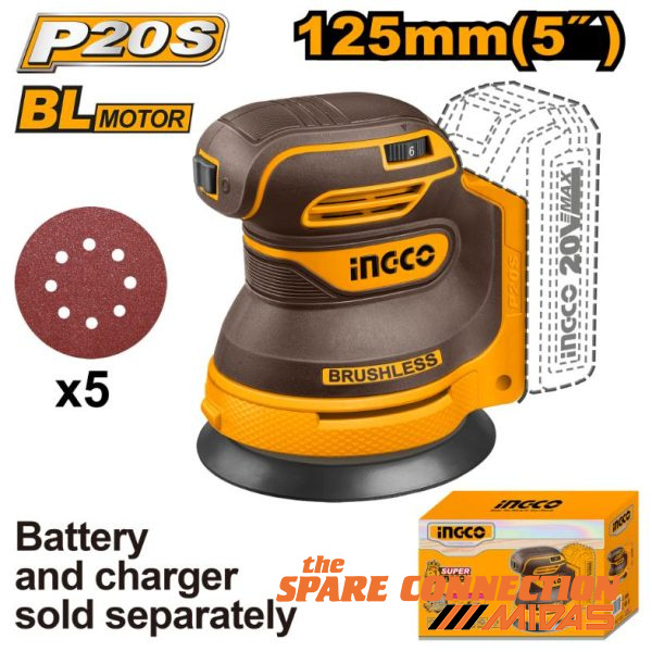 Voltage: 20VNo-load speed: 8 000 – 13 000 rpmBottom size: 125 mm (5”)5 Piece sand paperBattery and charger sold separately