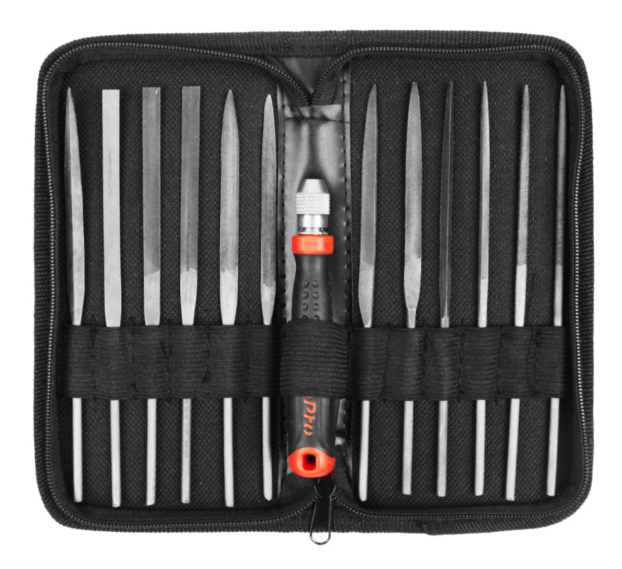 • Cushioned handle for positive grip and comfort• File length: 140mm• Shaft diameter: 3mm• Contents:Crossing file, round file, half round file, flat file, knife file, triangular file, square file, Barrette file, joint file, feather-edge file, Oval file, hand file
