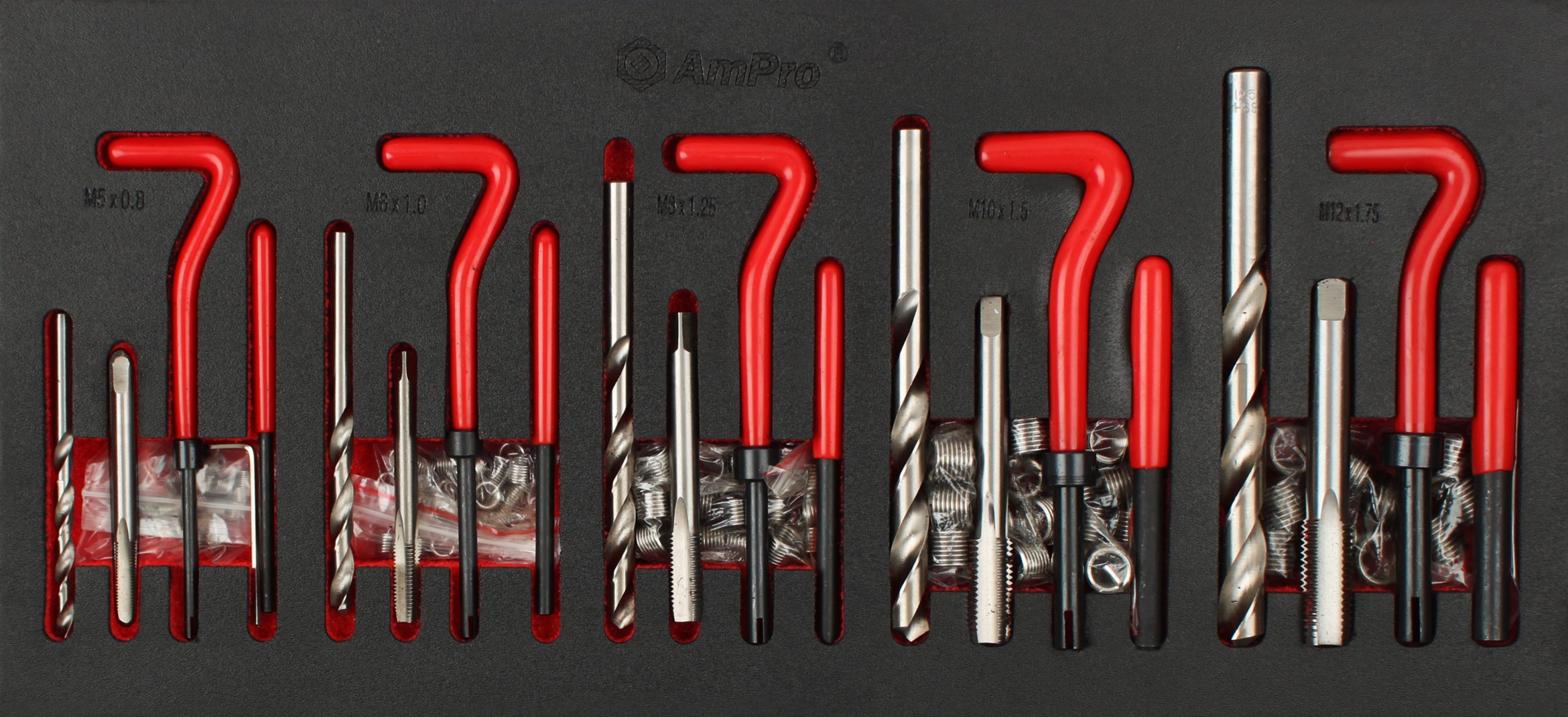 Contents:5 – installation Tools5 – Break Pin Tools5 – Twist Drills1 – Hex Key5 – Taps:M5 x 0.8 x 6.7mm, M6 x 1.0 x 10.8mm, M8 x 1.25 x 10.8mmM10 x 1.5 x 13.5mm, M12 x 1.75 x 16.3mm110 – Wire Thread Inserts